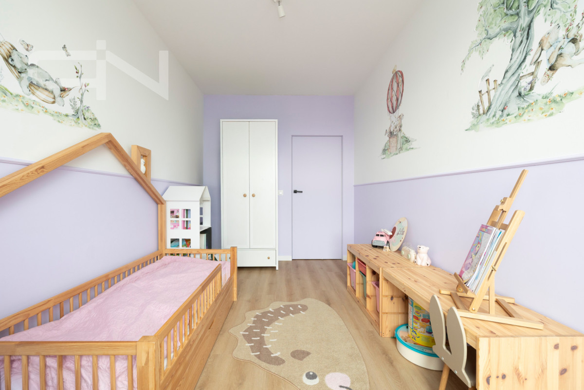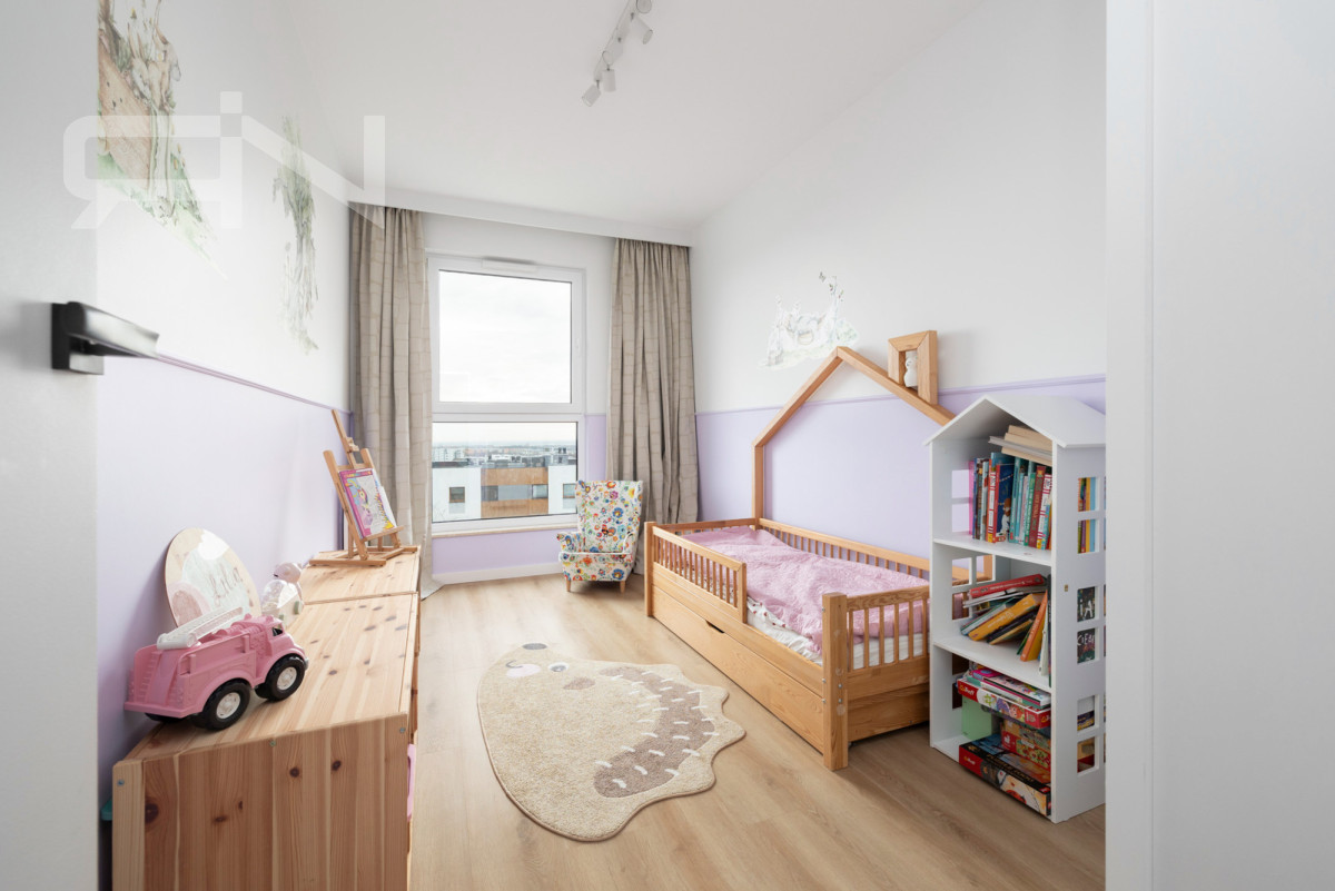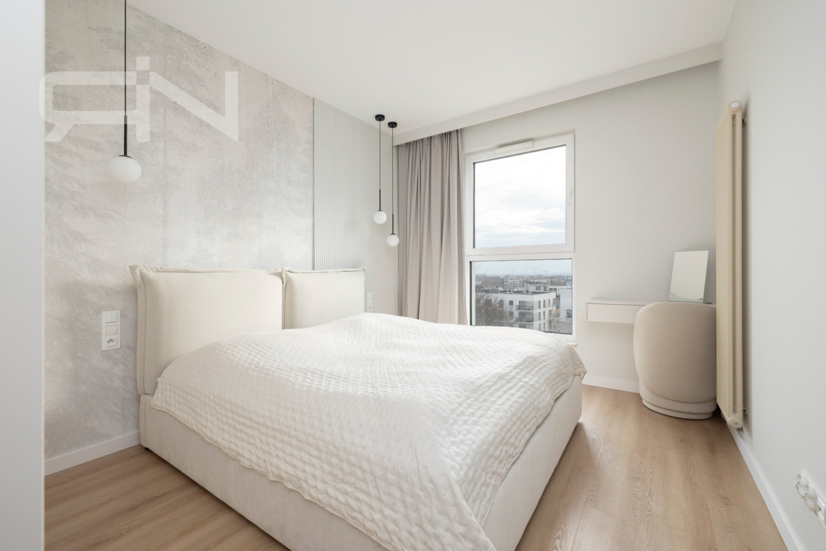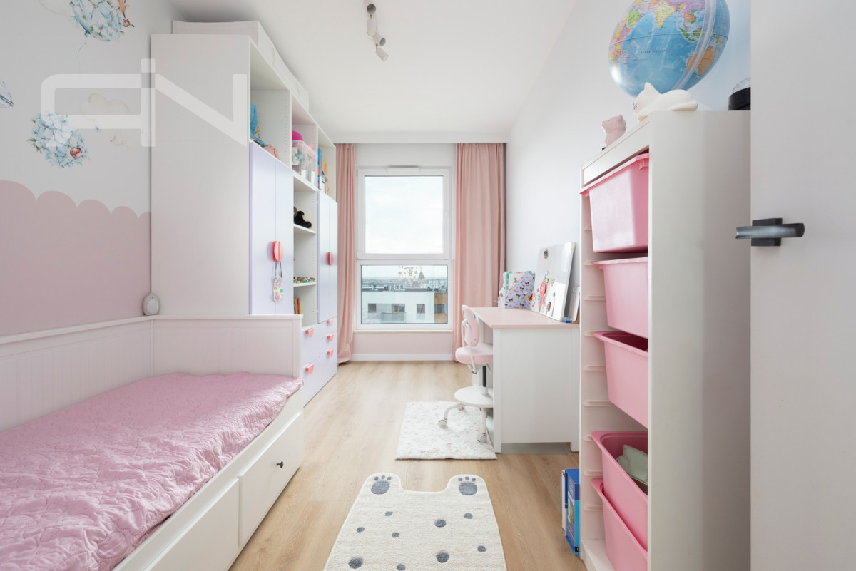W mieszkaniu znajdują się trzy oddzielne sypialnie. Główna sypialnia została urządzona w jasnym, spokojnym stylu i oferuje komfortową przestrzeń do odpoczynku. Dwa pozostałe pokoje obecnie pełnią funkcję pokoi dziecięcych, jednak dzięki ustawności mogą być również wykorzystane jako gabinet lub pokój gościnny.
