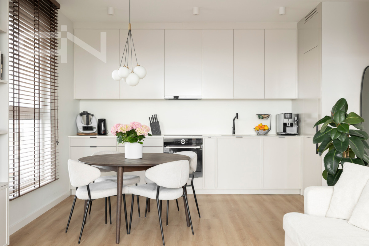 Kuchnia została wykonana w nowoczesnej zabudowie z dużą ilością miejsca do przechowywania oraz pełnym wyposażeniem AGD. W części dziennej znajduje się również miejsce na wygodną strefę wypoczynkową oraz jadalnię.