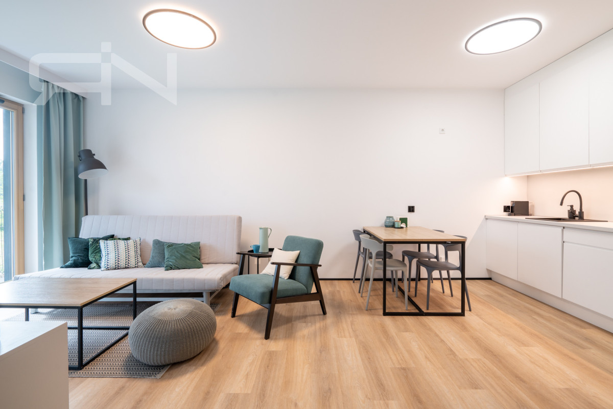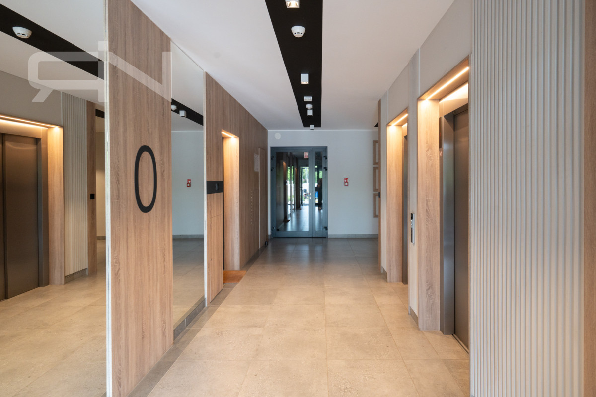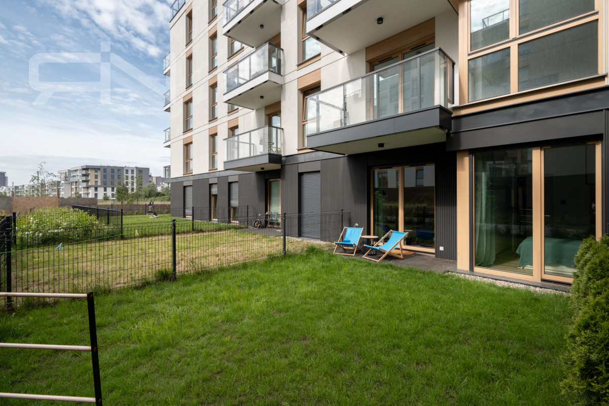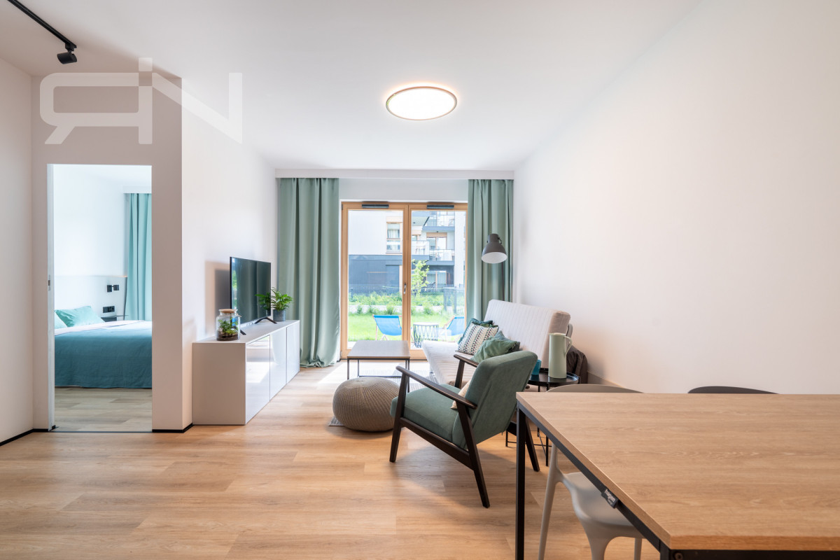 Mieszkanie o powierzchni 43 m2 zostało wykończone w wysokim standardzie. Zabudowy wykonane na wymiar, automatyczne panele zewnętrzne, system smart home dzięki, któremu przyszły nabywca może kontrolować mieszkanie będąc poza nim. Strefa dzienna z aneksem kuchennym, w której duże przeszklone drzwi dbają o doświetlenie oraz zapewnią płynną komunikację z ogrodem. Przestronna sypialnia z dużym przeszkleniem, przez które możemy wyjść do ogródka. Przedpokój z szafą w zabudowie, łazienka z kabiną prysznicową oraz garderoba. Mieszkanie w pełni wyposażone, gotowe do zamieszkania / wynajmu.