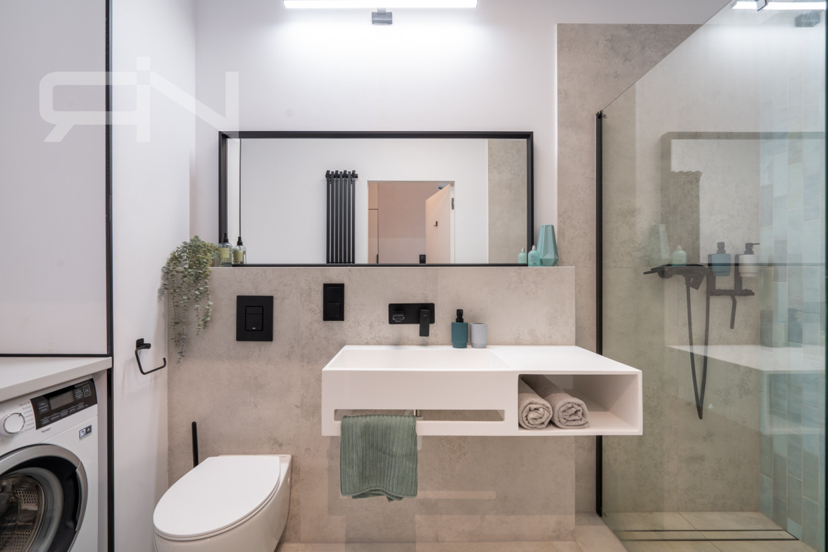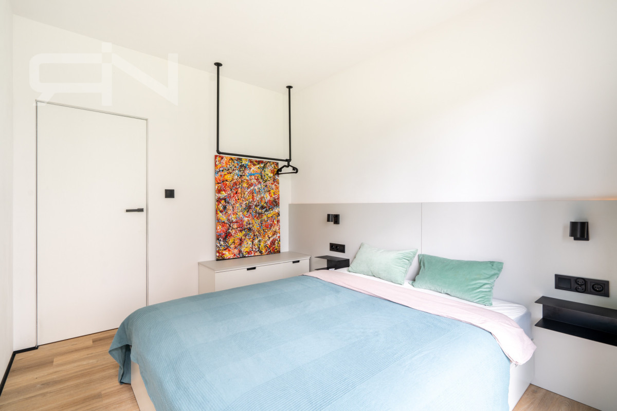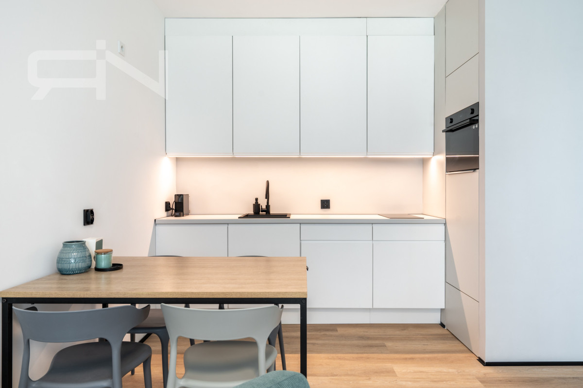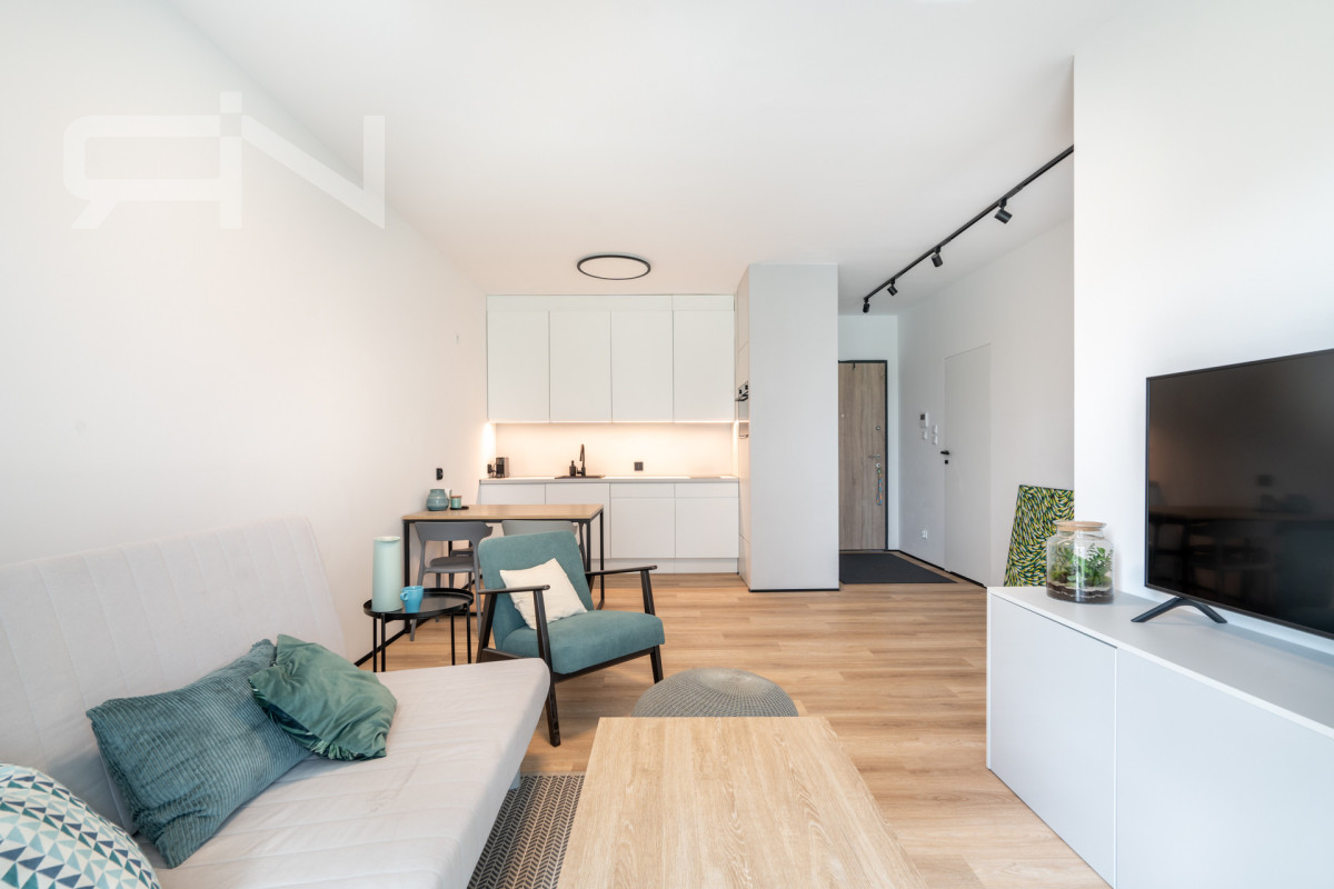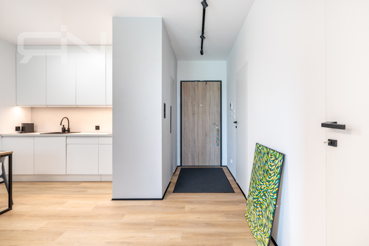 Mieszkanie o powierzchni 43 m2 zostało wykończone w wysokim standardzie. Zabudowy wykonane na wymiar, automatyczne panele zewnętrzne, system smart home dzięki, któremu przyszły nabywca może kontrolować mieszkanie będąc poza nim. Strefa dzienna z aneksem kuchennym, w której duże przeszklone drzwi dbają o doświetlenie oraz zapewnią płynną komunikację z ogrodem. Przestronna sypialnia z dużym przeszkleniem, przez które możemy wyjść do ogródka. Przedpokój z szafą w zabudowie, łazienka z kabiną prysznicową oraz garderoba. Mieszkanie w pełni wyposażone, gotowe do zamieszkania / wynajmu.