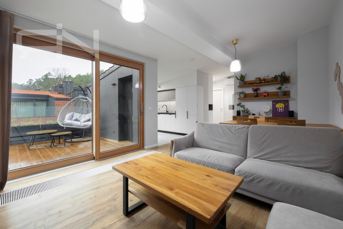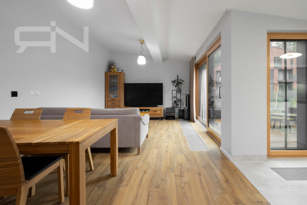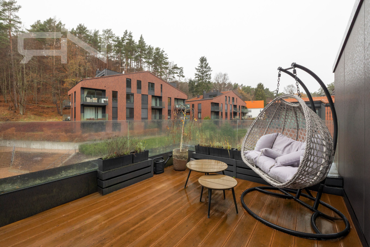 Mieszkanie wyposażone w klimatyzację uznanej firmy HAIER, jednostka pracująca znajduje się w garażu więc nie generuje hałasu w mieszkaniu. W mieszkaniu znajdują się okna trzyszybowe, nad tarasem automatyczna markiza, na tarasie szklane balustrady. Na dachu ceramiczna dachówka, a elewacja z naturalnych materiałów.