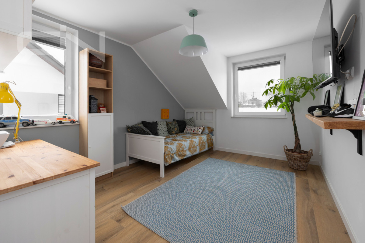 - Ogrzewanie podłogowe na poziomie 1 oraz grzejniki na poddaszu, piec gazowy, osobne sterowanie w każdym pomieszczeniu,